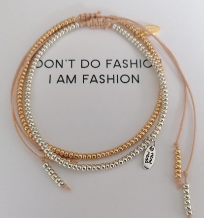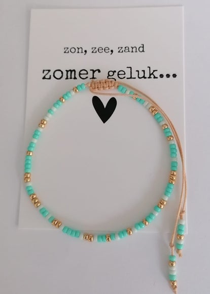 Enkelbandje op waxkoord, zilverkleurige of goudkleurige miyuki beads. Met schuifknoopje, past iedereen! Inclusief kaartje, zon,zee, zomergeluk!