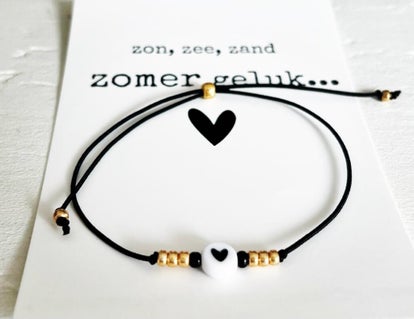 enkelbandje zwart of beige elastiek, turqoise kraaltjes en hartje, schuifknoop