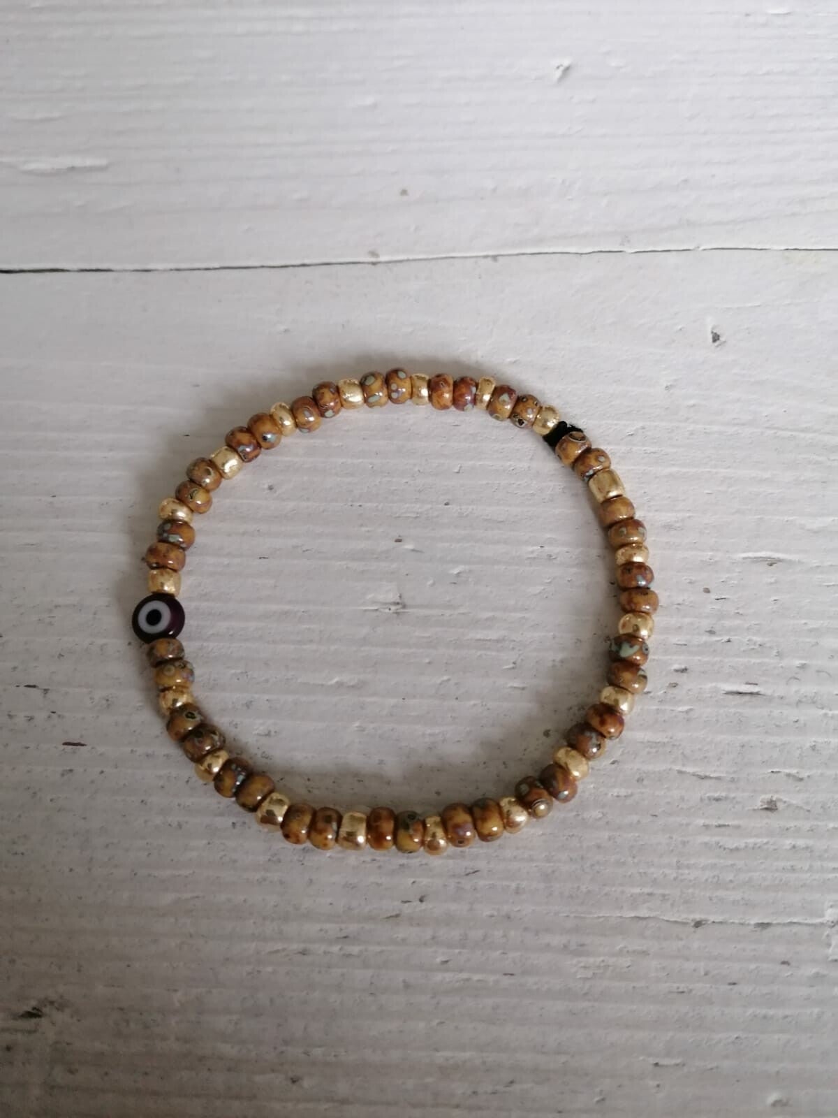 Armbandje van seed beads, bruin-goud met oogje