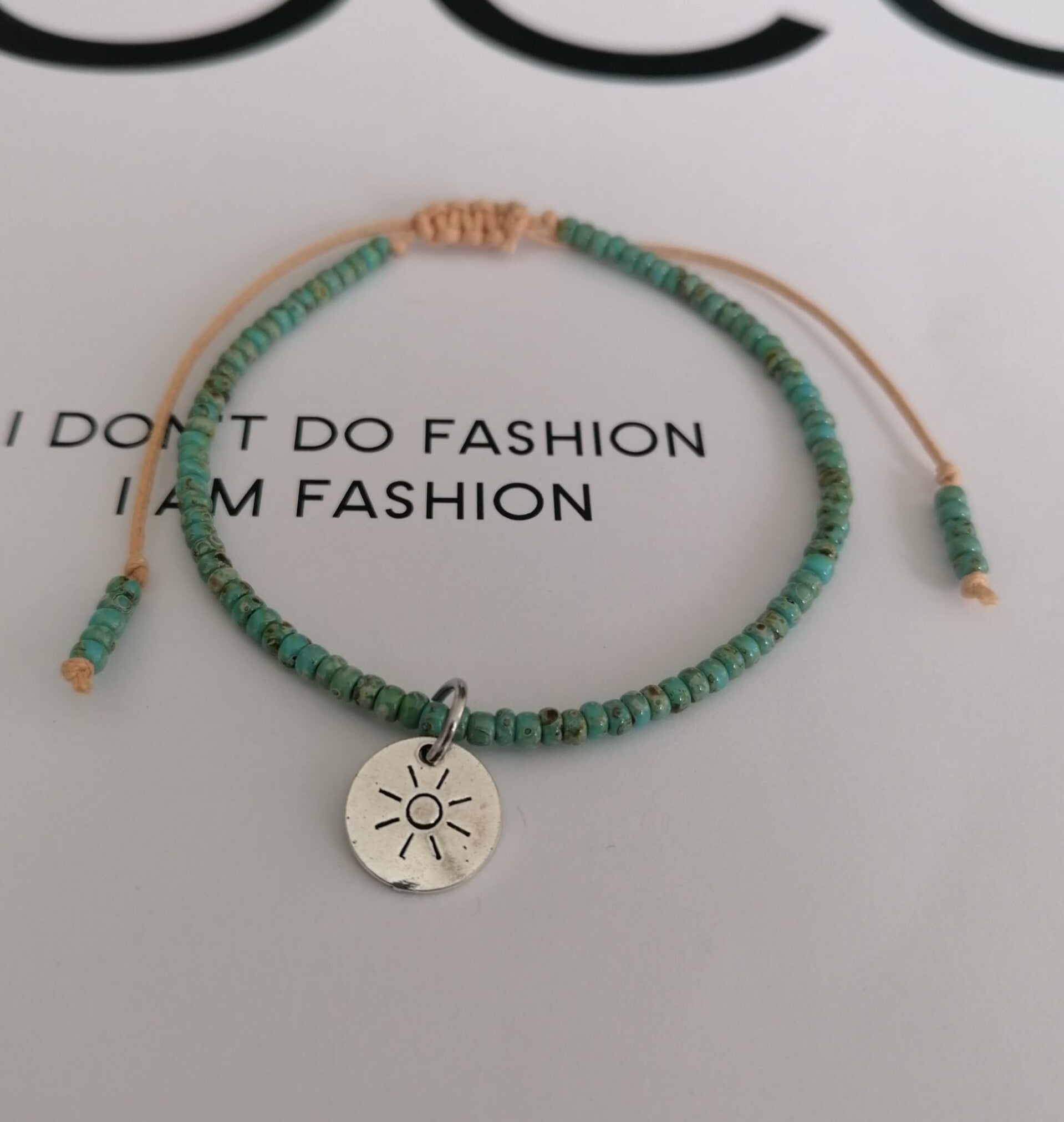 enkelbandje van miyuki kralen, op waxkoord met schuifknoopje en zon bedel