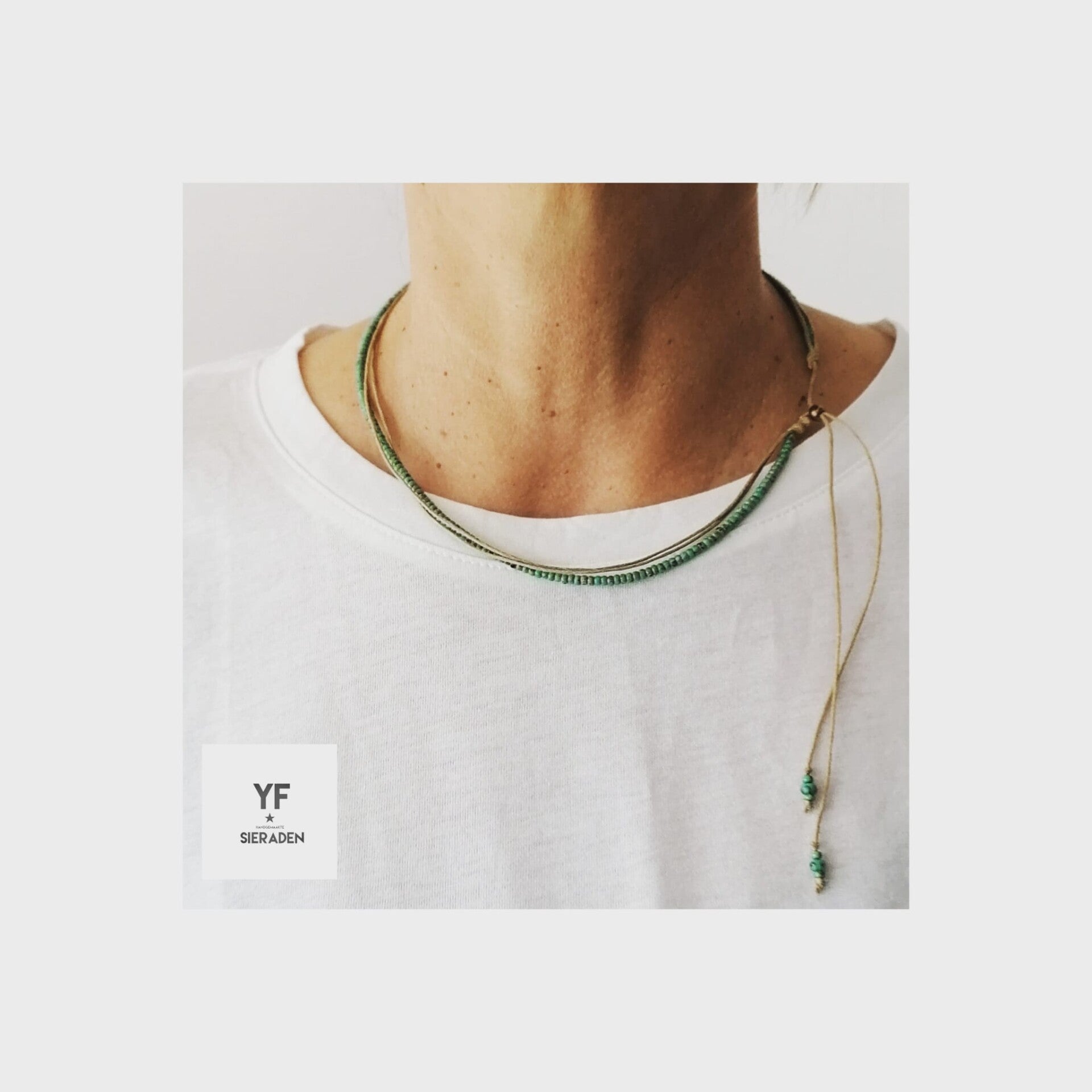 ketting met 2 strengen waxkoord en 1 streng kralen, met schuifknoopje, gemakkelijk te dragen en aan en uit te doen.