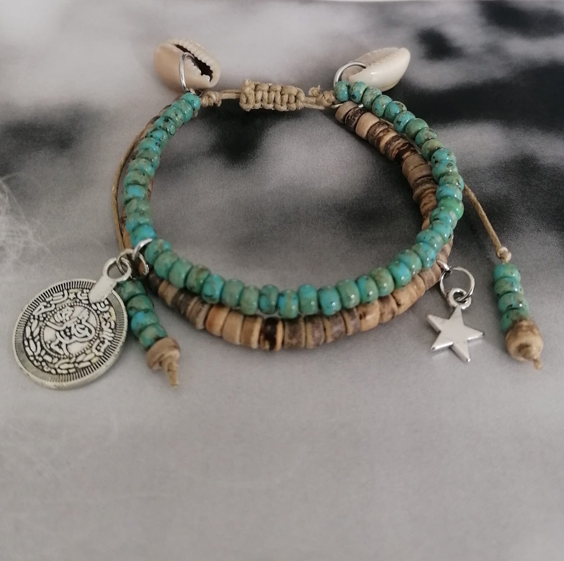 Armband miyuki en kokos kralen, met kauri schelpjes en bedeltjes.