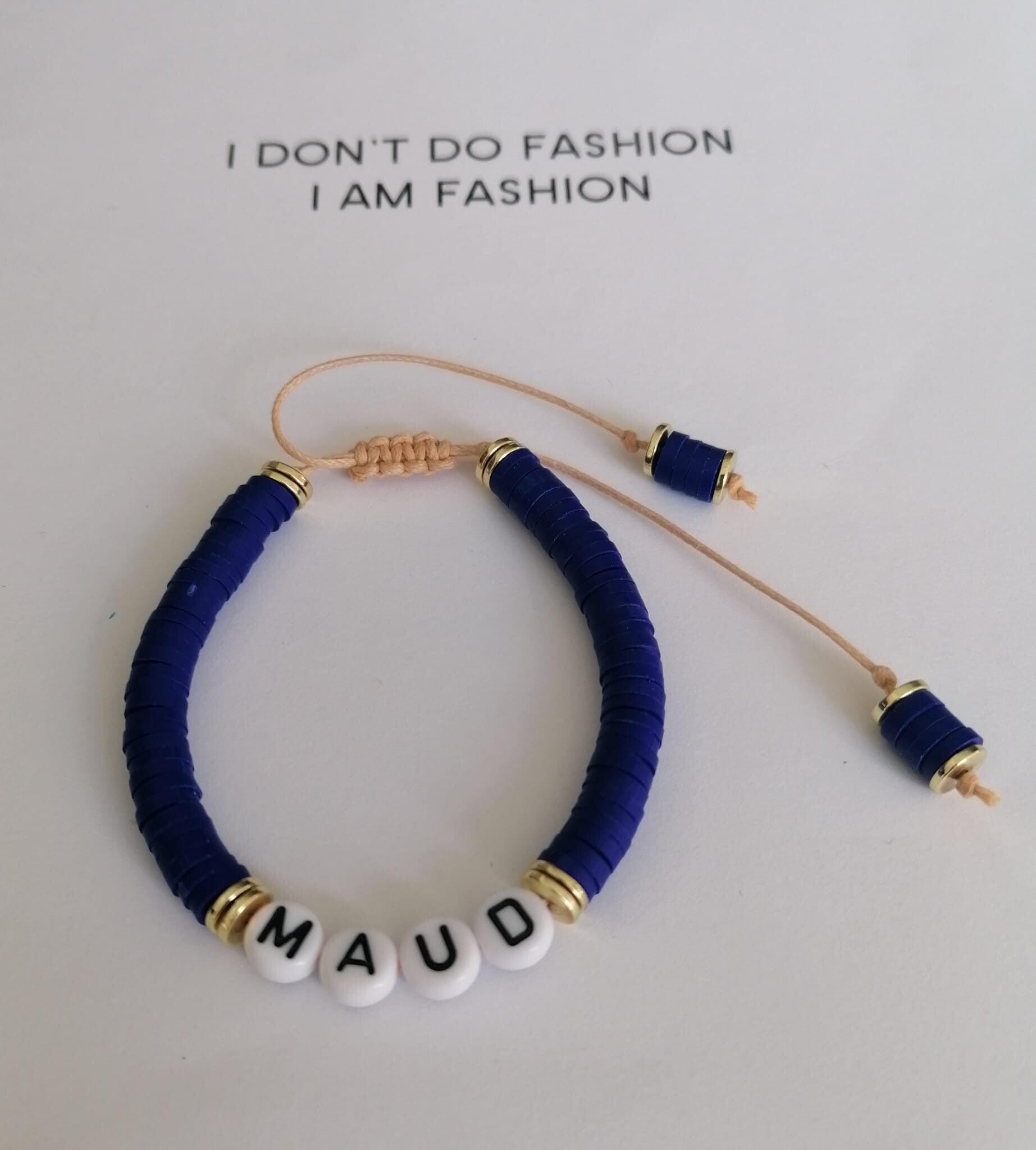 Naam armbandje van katsuki en goude schijf kralen, op waxkoord met schuifknoopje
