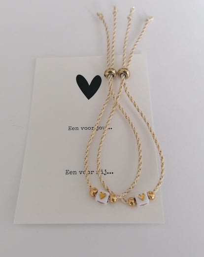 Armbandjes van goud-wit koord met goud hartje, met schuifkraal